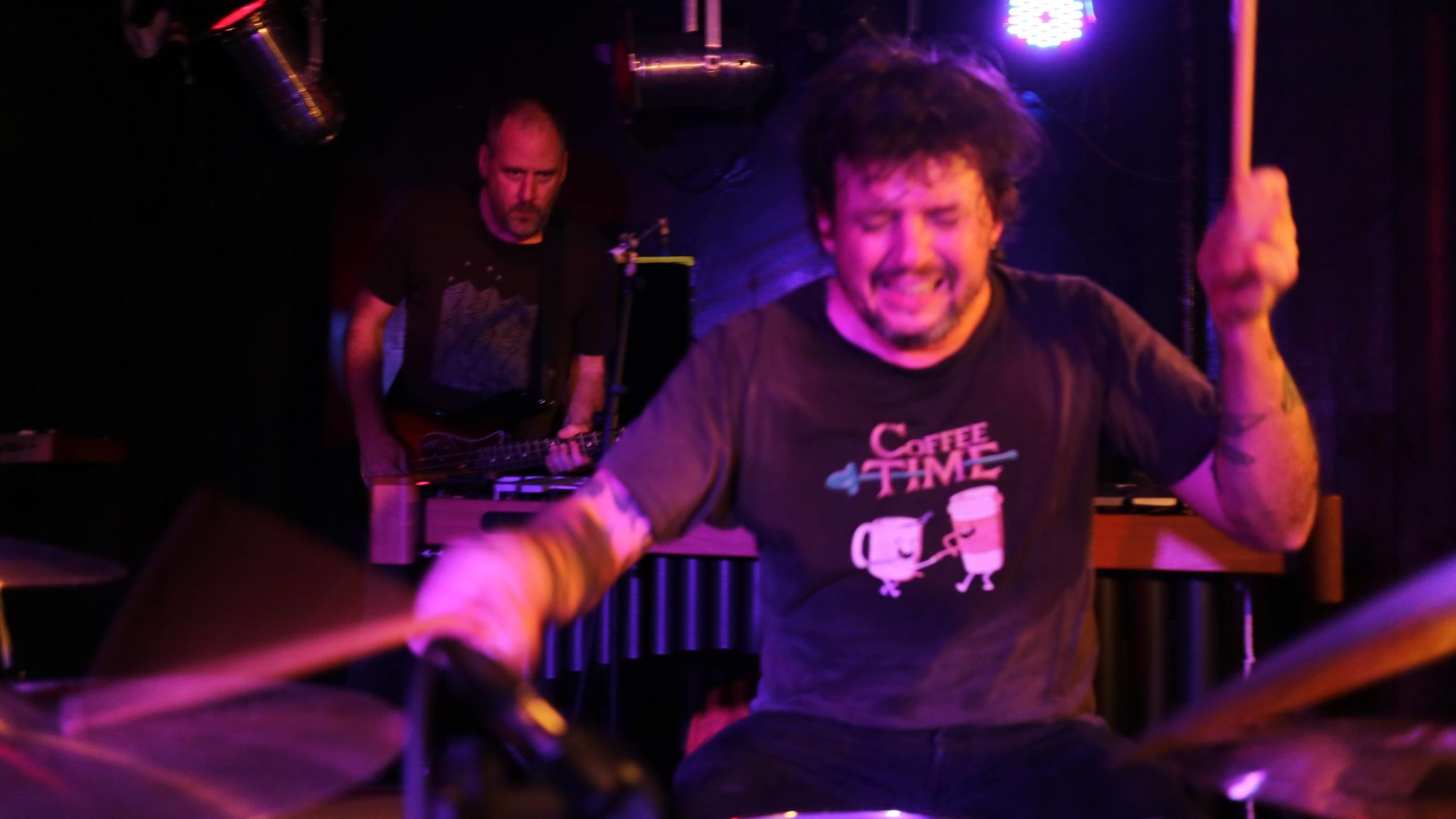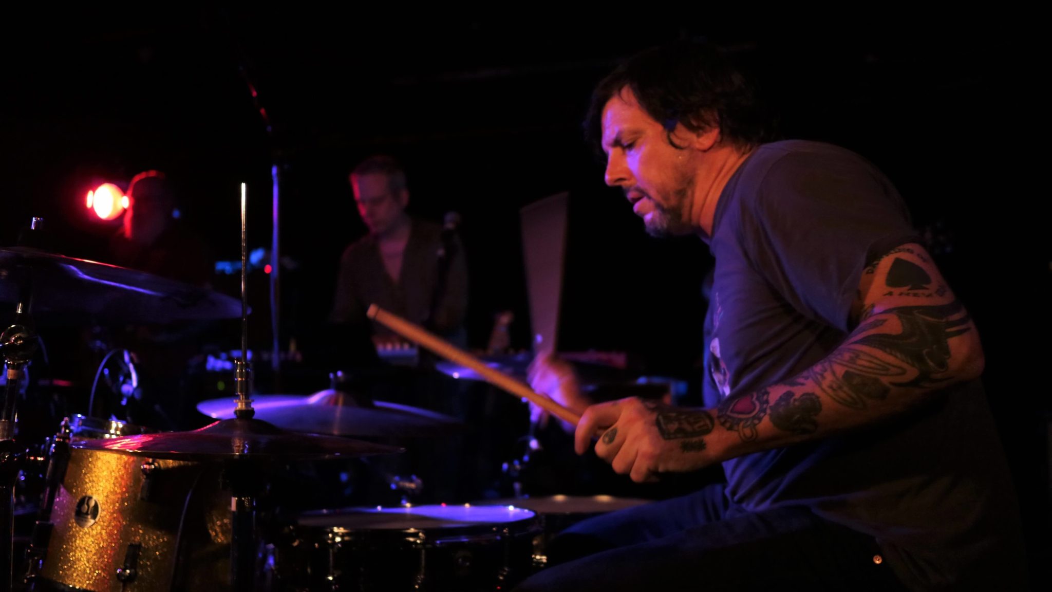 John McEntire is the groove master, sitting in the pocket and playing incredibly tight, uncomplicated beats, using the butt of the sticks on the snare. He takes the throne when the song needs something simple to lock in with McCombs. He also grimaces and looks like he is in pain while he plays. John Herndon, however, doesn’t merely play the drums, he beats them into submission. He is the monster, unleashing his frenetic energy to add busy percussive flavour to the mix. Dan Bitney sits in the middle, complementing everyone as drum duets form. He adds those extra elements that one drummer cannot offer with four limbs alone.